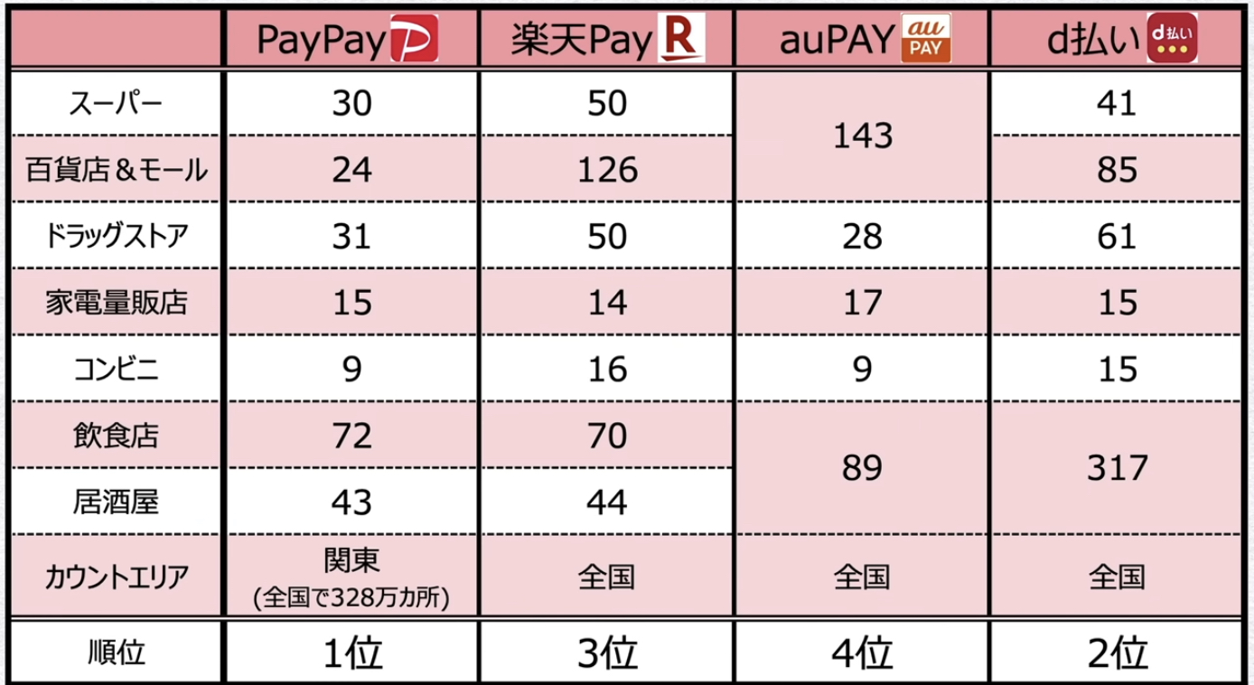 1位:PayPay、2位:d払い、3位:楽天Pay、4位:au PAY