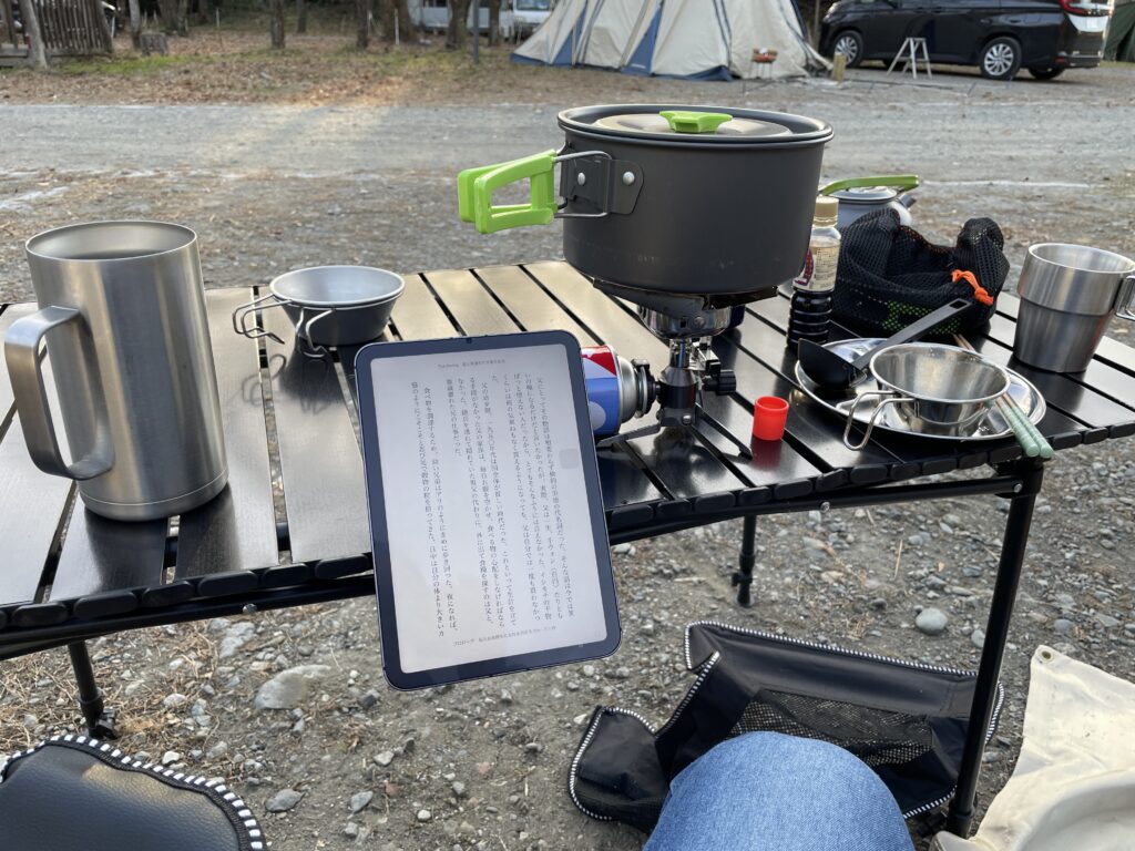 焚き火の心地よい音と暖かさで、読書が捗ります☺️
